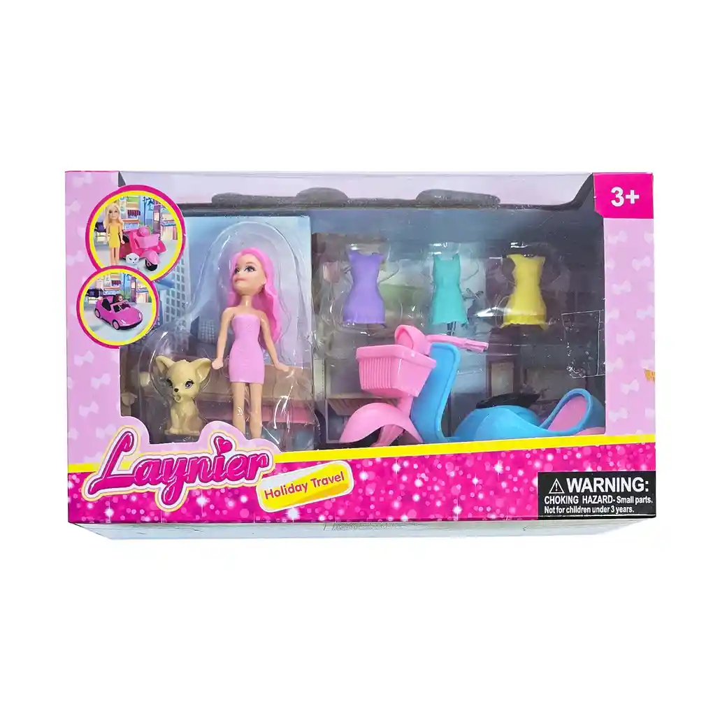 Esta muñeca viene acompañada de su adorable mascota, tres vestidos adicionales llenos de estilo y una motocicleta de juguete con un compartimiento especial para llevar a su pequeña compañera. Con cada accesorio, las niñas pueden crear aventuras emocionantes y personalizar los looks de la muñeca, desarrollando su imaginación y creatividad en un mundo lleno de posibilidades y diversión. Ficha Técnica: Dimensiones Muñeca: 7 cm x 3 cm x 1 cm Dimensiones del empaque : 22 cm x 12 cm x 9 cm Material: Plástico ABS Edad recomendada: + 3 años Referencia: C2561 Certificado de conformidad: E5-0359-2021 ** _Para defectos de fábrica o retractos: \_Por favor revise el producto apenas lo reciba y antes de usarlo. No aplican ley de retracto o defectos de fábrica luego de usar el producto. Se manejan máximo 5 días para reportar defectos de fábrica (por ejemplo, producto funciona mal, piezas faltantes, rotas, etc). Para hacer efectiva la devolución el producto debe devolverse con el empaque original, el cual debe estar en buen estado, incluir todos los documentos y las partes completas y sin daños.
