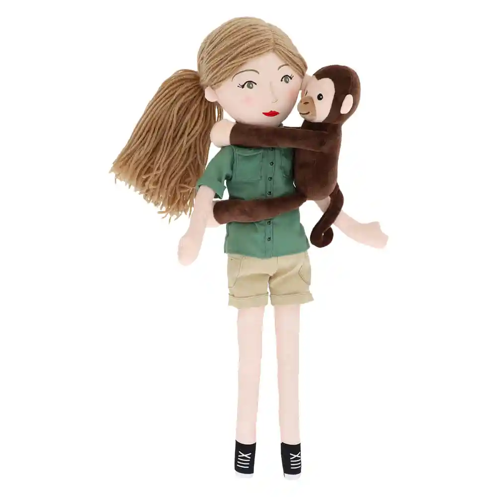 Muñeca de Tela Jane Goodall. Considerada la mayor experta en el estudio de chimpancés de todo el mundo. Siempre tuvo África en la mira y trabajó incansablemente hasta conseguir los medios para llegar a ella. En Kenia conoció al antropólogo Louis Leakey quien la contrató de asistente y posteriormente la animó a adentrarse en lo salvaje para a observar a los chimpancés, esperando que sus conclusiones aportaran información sobre la evolución humana. Goodall sabía que no era tan simple como instalarse cerca de los chimpancés sin que huyeran y optó por ganarse su confianza. Encontró un punto alto desde donde observarlos con binoculares, y todos los días se acercaba al mismo lugar para que ellos pudieran verla. Así se acostumbraron a su presencia. Jane Goodall comenzó a tener una cercanía inédita con los animales y pudo conocer su comportamiento. Los resultados de sus exhaustivas investigaciones revolucionaron a la comunidad científica, y cambiaron completamente la visión de los simios y en especial sobre los chimpancés. Es considerada una de las mujeres científicas de mayor impacto en el siglo XX. Actualmente se dedica a viajar alrededor del mundo para concienciar a las personas sobre la importancia de conservar los hábitats y preservar la biodiversidad. En 1977 fundó el Instituto Jane Goodall, presente en más de 30 países, para labores de conservación en África. Esta muñeca es parte de la colección de muñecas de mujeres que cambiaron la historia.