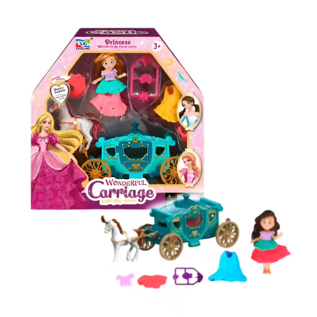 ¡Vive un cuento de hadas lleno de fantasía! Este encantador set incluye una linda muñeca princesa, un elegante carruaje y un caballo listo para llevarla a sus aventuras reales. Con detalles coloridos y accesorios intercambiables, las niñas podrán crear historias mágicas mientras desarrollan su imaginación y juego creativo. ¡El regalo perfecto para soñar y jugar como una verdadera princesa! Ficha Técnica: Dimensiones: 20 cm x 20 cm x 7 cm Material: Plástico ABS Edad recomendada: + 3 años Certificado de conformidad: E5-0359-2021 Referencia: C4551 Términos de garantía:Para defectos de fábrica o retractos: Por favor revise el producto apenas lo reciba y antes de usarlo. No aplican ley de retracto o defectos de fábrica luego de usar el producto. Se manejan máximo 5 días para reportar defectos de fábrica (por ejemplo, producto funciona mal, piezas faltantes, rotas, etc). Para hacer efectiva la devolución el producto debe devolverse con el empaque original, el cual debe estar en buen estado, incluir todos los documentos y las partes completas y sin daños.