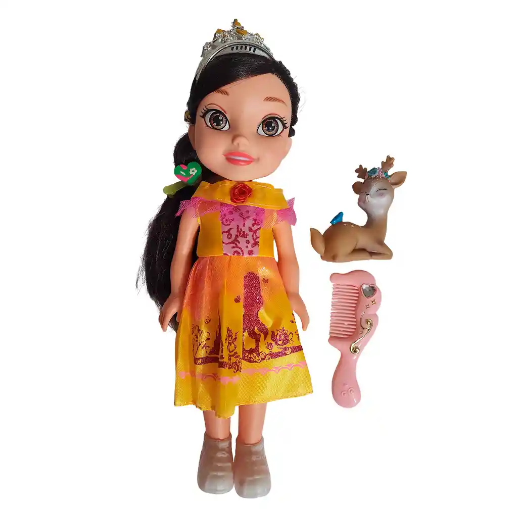 ¡Abre las puertas a un mundo de fantasía y vive tu propio cuento de hadas con esta encantadora Princesa del Bosque! Inspirada en los personajes más queridos, esta dulce muñeca está lista para reinar con su brillante tiara y su icónico vestido de gala que evoca historias mágicas. Con su largo y sedoso cabello , perfecto para peinar, no está sola en sus aventuras; la acompaña su inseparable y tierno amigo, un adorable cervatillo del bosque. Ya sea preparándose para el baile real con su elegante espejo o compartiendo secretos con su amigo animal, esta princesa es la protagonista ideal para despertar la imaginación y permitir que cada pequeña soñadora se convierta en la heroína de su propio reino encantado. Ficha Técnica: Material: Plástico ABS Dimensiones : 35 cm x 12 cm x 6 cm Apto para bebes + 3 Años Certificado de conformidad: E5-0359-2021 Referencia: JM1359 ** _Para defectos de fábrica o retractos: \_Por favor revise el producto apenas lo reciba y antes de usarlo. No aplican ley de retracto o defectos de fábrica luego de usar el producto. Se manejan máximo 5 días para reportar defectos de fábrica (por ejemplo, producto funciona mal, piezas faltantes, rotas, etc). Para hacer efectiva la devolución el producto debe devolverse con el empaque original, el cual debe estar en buen estado, incluir todos los documentos y las partes completas y sin daños.
