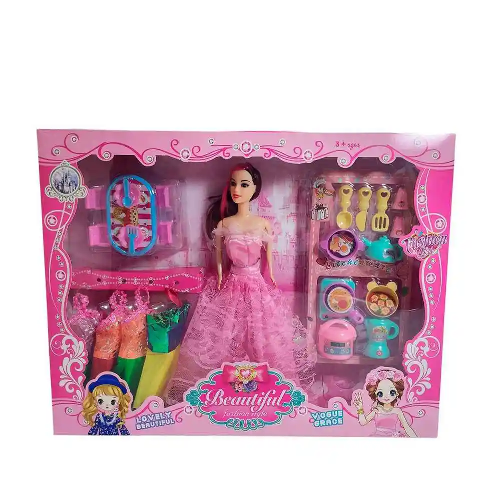 Vive un cuento de hadas moderno con este espectacular set de muñeca "Beautiful fashion style". La protagonista es una elegante muñeca "Vogue Grace" luciendo un deslumbrante vestido de gala con detalles de encaje. Este set de "Noble Castle" lleva el juego a otro nivel al incluir tres vestidos adicionales de diferentes estilos para cambiar su look, un completo set de "Kitchen ware" con ollas, teteras y utensilios para preparar banquetes, y un encantador mueble azul tipo tocador. Es el paquete de regalo perfecto para mayores de 3 años, ideal para inspirar horas de historias mágicas, desfiles de moda y vida en el palacio. Ficha Técnica: Dimensiones : 30 cm x 7 cm Material: Plástico ABS Edad recomendada + 3 Años Referencia: 824C2 Certificado de conformidad: CS-LCO-13233-2021S2/432 ** _Para defectos de fábrica o retractos: \_Por favor revise el producto apenas lo reciba y antes de usarlo. No aplican ley de retracto o defectos de fábrica luego de usar el producto. Se manejan máximo 5 días para reportar defectos de fábrica (por ejemplo, producto funciona mal, piezas faltantes, rotas, etc). Para hacer efectiva la devolución el producto debe devolverse con el empaque original, el cual debe estar en buen estado, incluir todos los documentos y las partes completas y sin daños.