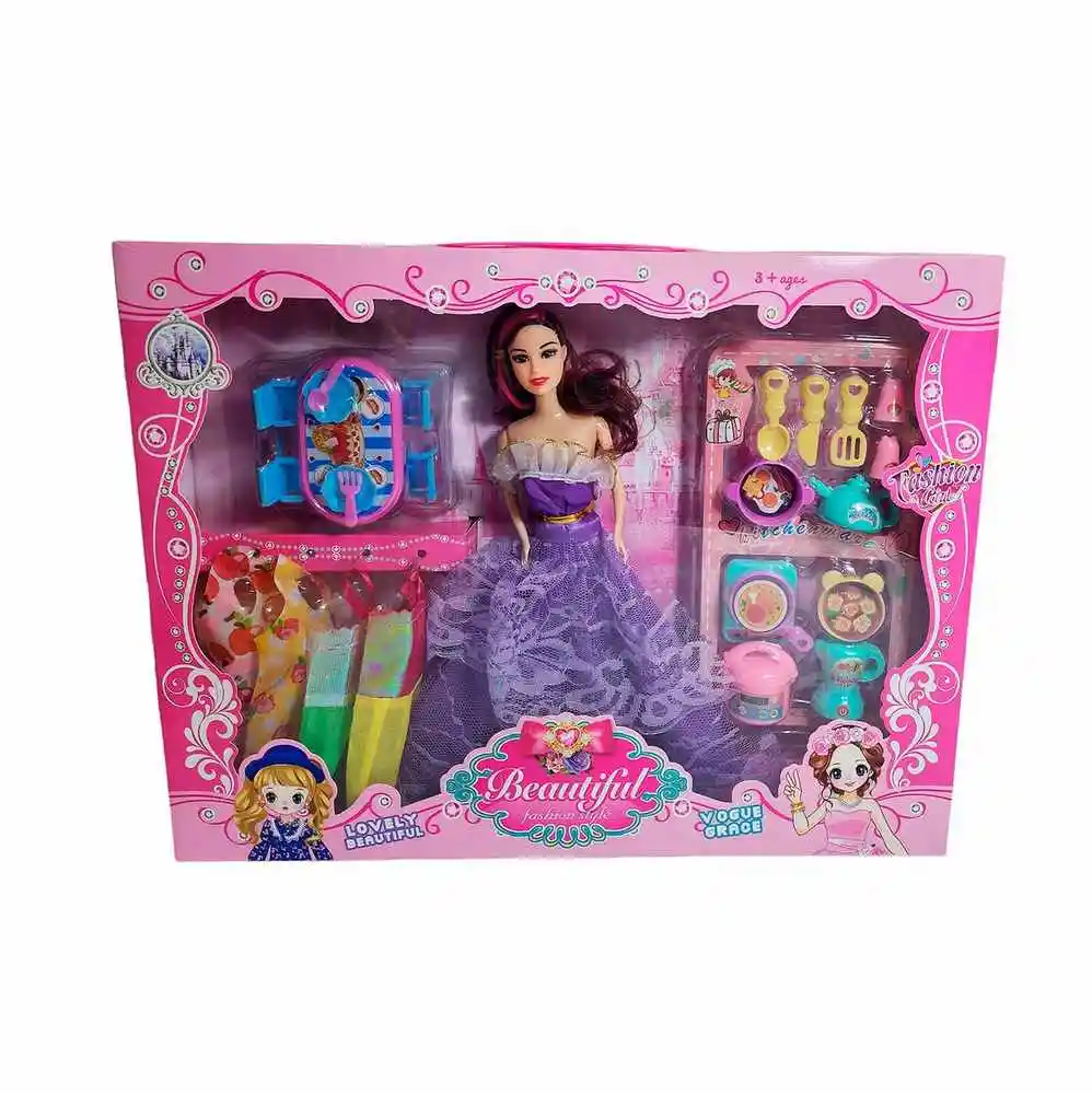 Vive un cuento de hadas moderno con este espectacular set de muñeca "Beautiful fashion style". La protagonista es una elegante muñeca "Vogue Grace" luciendo un deslumbrante vestido de gala con detalles de encaje. Este set de "Noble Castle" lleva el juego a otro nivel al incluir tres vestidos adicionales de diferentes estilos para cambiar su look, un completo set de "Kitchen ware" con ollas, teteras y utensilios para preparar banquetes, y un encantador mueble azul tipo tocador. Es el paquete de regalo perfecto para mayores de 3 años, ideal para inspirar horas de historias mágicas, desfiles de moda y vida en el palacio. Ficha Técnica: Dimensiones : 30 cm x 7 cm Material: Plástico ABS Edad recomendada + 3 Años Referencia: 824C2 Certificado de conformidad: CS-LCO-13233-2021S2/432 ** _Para defectos de fábrica o retractos: \_Por favor revise el producto apenas lo reciba y antes de usarlo. No aplican ley de retracto o defectos de fábrica luego de usar el producto. Se manejan máximo 5 días para reportar defectos de fábrica (por ejemplo, producto funciona mal, piezas faltantes, rotas, etc). Para hacer efectiva la devolución el producto debe devolverse con el empaque original, el cual debe estar en buen estado, incluir todos los documentos y las partes completas y sin daños.