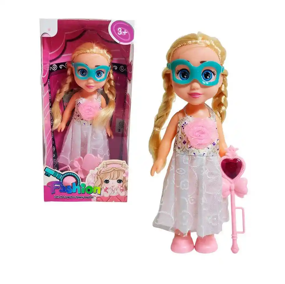 Despierta la magia y la moda con esta encantadora muñeca "Fashion" de la colección "Let's live together. Happy together." Esta adorable muñeca está lista para cualquier baile de máscaras o aventura mágica con su peinado de dos coquetos moños rubios y un llamativo antifaz rosa. Su atuendo es un sueño, luciendo un elegante vestido de tul y delicados pétalos de flores adornando la falda. Para completar su look, viene armada con su propio cetro mágico rosa, coronado por una joya en forma de corazón. Es el regalo perfecto para niñas mayores de 3 años, inspirando horas de juego imaginativo y diversión con estilo. Ficha Técnica: Dimensiones : 20 cm x 7 cm Material: Plástico ABS Edad recomendada + 3 Años Referencia: 620A11 YG2301A-1 Certificado de conformidad: CS-LCO-13233-2021S2/432 ** _Para defectos de fábrica o retractos: \_Por favor revise el producto apenas lo reciba y antes de usarlo. No aplican ley de retracto o defectos de fábrica luego de usar el producto. Se manejan máximo 5 días para reportar defectos de fábrica (por ejemplo, producto funciona mal, piezas faltantes, rotas, etc). Para hacer efectiva la devolución el producto debe devolverse con el empaque original, el cual debe estar en buen estado, incluir todos los documentos y las partes completas y sin daños.