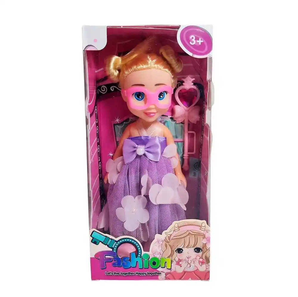 Despierta la magia y la moda con esta encantadora muñeca "Fashion" de la colección "Let's live together. Happy together." Esta adorable muñeca está lista para cualquier baile de máscaras o aventura mágica con su peinado de dos coquetos moños rubios y un llamativo antifaz rosa. Su atuendo es un sueño, luciendo un elegante vestido de tul y delicados pétalos de flores adornando la falda. Para completar su look, viene armada con su propio cetro mágico rosa, coronado por una joya en forma de corazón. Es el regalo perfecto para niñas mayores de 3 años, inspirando horas de juego imaginativo y diversión con estilo. Ficha Técnica: Dimensiones : 20 cm x 7 cm Material: Plástico ABS Edad recomendada + 3 Años Referencia: 620A11 YG2301A-1 Certificado de conformidad: CS-LCO-13233-2021S2/432 ** _Para defectos de fábrica o retractos: \_Por favor revise el producto apenas lo reciba y antes de usarlo. No aplican ley de retracto o defectos de fábrica luego de usar el producto. Se manejan máximo 5 días para reportar defectos de fábrica (por ejemplo, producto funciona mal, piezas faltantes, rotas, etc). Para hacer efectiva la devolución el producto debe devolverse con el empaque original, el cual debe estar en buen estado, incluir todos los documentos y las partes completas y sin daños.