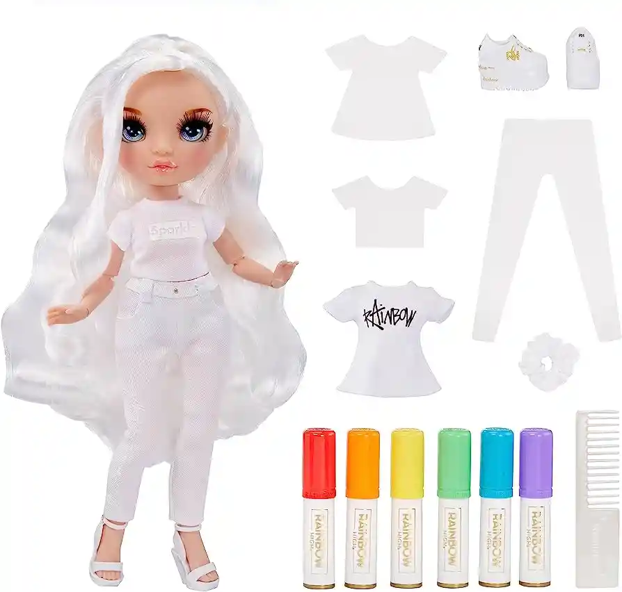 Muñeca Rainbow High Color Create 100% Original, autentica MGA. Ella viene vestida completamente de blanco, tiene el pelo blanco y viene con un top blanco extra, un par de zapatillas blancas y un coletero, para que puedas colorearlo todo con el color del marcador lavable del arcoíris incluido. Con marcadores rojos, naranjas, amarillos, verdes, azules y morados puedes crear tu propia muñeca Rainbow High™, es muy fácil. ¡CRÉALO! Con los colores de marcadores lavables del arco iris incluidos, es fácil hacer cualquier diseño que desee en el cabello y la ropa. Pueden ser súper simples con lunares, corazones y rayas, o puede ser más avanzado y crear un estilo de corbata. Hay tantas opciones. La mejor parte, si no te gusta, solo enjuaga y repite. Es tan fácil empezar todo de nuevo. ¡JUGAR! Una vez que su hijo haya terminado de crear, la muñeca está lista para jugar. Las nuevas y divertidas creaciones y diseños de colores inspirarán tantas historias divertidas para jugar con todas las muñecas Rainbow High™. ENJUAGAR Y REPETIR! Los rotuladores lavables te facilitan mucho lavar el cabello y la ropa. Luego lo coloreas, lo creas y juegas con él una y otra vez. HERMOSAS CARACTERÍSTICAS: La muñeca Color & Create™ tiene un hermoso cabello largo y liso con una cola de caballo en la parte superior, pestañas largas y ojos de vidrio. Colecciona el arcoíris de todas las muñecas Color & Create™. QUÉ ESTÁ INCLUIDO: 1 muñeca de moda exclusiva con atuendo completo y zapatos de muñeca, blusa adicional para muñeca, coletero adicional para muñeca, zapatillas adicionales para muñeca, 6 marcadores lavables de arcoíris. OJO SE RECOMIENDA USO BAJO SUPERVISION DE UN ADULTO.