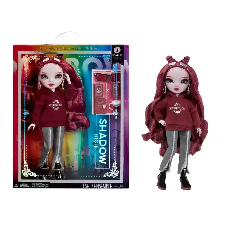 ADVERTENCIA: Este producto puede contener piezas pequeñas, que representen riesgo de asfixia. Se sugiere supervisión de un adulto. Marca MGA Entertaiment. Muñeca de moda Shadow High Rainbow High 2023 ¡Muñeca de moda, con características impresionantes, cabello peinado y articulado para toneladas de poses! Scarlett Rose va vestida de rojo granate de la cabeza a los pies. Expresa su propio estilo con su sudadera con capucha, vaqueros, botines y pendientes de aro. Además, lleva gafas de sol deportivas. Lleva el pelo rojo granate parcialmente recogido con dos bonitos moños sujetos con horquillas plateadas y el resto suelto en grandes rizos. Lleva largas pestañas reales y ojos de cristal. La muñeca mide 28 cm. Los productos son 100% originales y adquiridos directamente a las marcas.