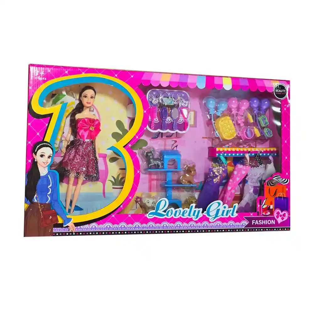 Esta muñeca, vestida con un majestuoso traje de reina princesa, es el epítome de la elegancia y el juego imaginativo. Viene acompañada de una fabulosa colección de accesorios, que incluye dos collares, dos coronas, dos peines y dos espejos, perfectos para crear diferentes estilos reales. Además, la muñeca tiene cuatro adorables mascotas, cinco vestidos adicionales para cambiar de look, globos y otros divertidos complementos que invitan a horas de juego creativo y mágico. Ficha técnica: Dimensiones de la Muñeca : 30 cm x 10 cm Dimensiones del empaque: 58 cm x 33 cm x 5 cm Material : Plástico ABS Edad recomendada : +3 años Referencia: 8189D3 Certificado de conformidad: CS-LCO-13233-2021S2/432 ** _Para defectos de fábrica o retractos: \_Por favor revise el producto apenas lo reciba y antes de usarlo. No aplican ley de retracto o defectos de fábrica luego de usar el producto. Se manejan máximo 5 días para reportar defectos de fábrica (por ejemplo, producto funciona mal, piezas faltantes, rotas, etc). Para hacer efectiva la devolución el producto debe devolverse con el empaque original, el cual debe estar en buen estado, incluir todos los documentos y las partes completas y sin daños.