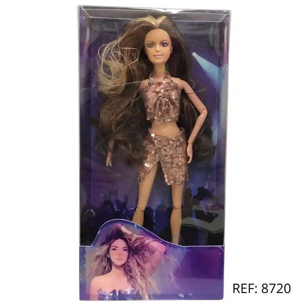 Muñeca Shakira con outfit brillante y cabello largo, inspirada en la estrella pop para juego y colección. 16CM X 31CM APROX.