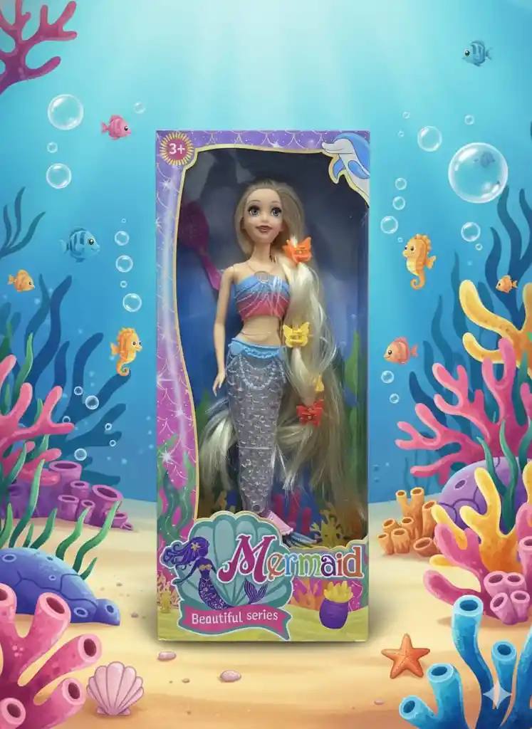 🧜♀️✨ Muñeca Sirena “Mermaid – Beautiful Series” 🌊💖 Sumérgete en un mundo mágico bajo el mar con esta hermosa muñeca sirena, diseñada para inspirar historias llenas de fantasía, creatividad y diversión. Su estilo encantador y colores brillantes la convierten en el regalo ideal para las niñas amantes del océano y los cuentos de sirenas. 🌈 Características destacadas: 🧜♀️ Diseño de sirena con cola brillante y detalles marinos 💇♀️ Cabello largo y sedoso, ideal para peinar y crear estilos 🎀 Accesorios decorativos en el cabello 🎨 Colores vivos y acabados llamativos 📦 Presentación en caja ilustrada temática del océano 🧠 Beneficios: Estimula la imaginación y el juego creativo Favorece el juego de roles y la narración de historias Ideal para coleccionar o regalar 👧 Edad recomendada: 3 años en adelante 🎁 Perfecta para cumpleaños, regalos especiales o simplemente para sorprender con un detalle mágico. ¡Una sirena que hará brillar la imaginación! ✨🌊