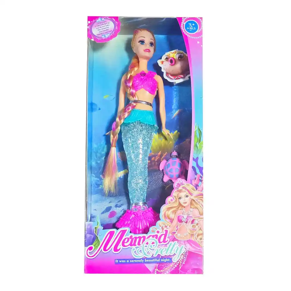 Esta muñeca sirena, con una cola de sirena en colores vibrantes y acabados detallados que le dan un aspecto sorprendentemente realista, viene acompañada de una encantadora tortuga que añade un toque de ternura y magia al juego. Diseñada para estimular la imaginación, este juguete permite a las niñas sumergirse en fantásticas aventuras submarinas, creando historias llenas de creatividad y diversión. /// Nota: Algunos colores del vestido y el cabello de la muñeca pueden variar ligeramente /// Ficha Técnica: Dimensiones de la muñeca: 34 cm x 10 cm Dimensiones del empaque: 37 cm x 17 cm x 4 cm Material: Plástico ABS no toxico Edad recomendada + 3 Años Certificado de conformidad: CS-LCO-13233-2021S2/432 Referencia: 33781C ** _Para defectos de fábrica o retractos: \_Por favor revise el producto apenas lo reciba y antes de usarlo. No aplican ley de retracto o defectos de fábrica luego de usar el producto. Se manejan máximo 5 días para reportar defectos de fábrica (por ejemplo, producto funciona mal, piezas faltantes, rotas, etc). Para hacer efectiva la devolución el producto debe devolverse con el empaque original, el cual debe estar en buen estado, incluir todos los documentos y las partes completas y sin daños.