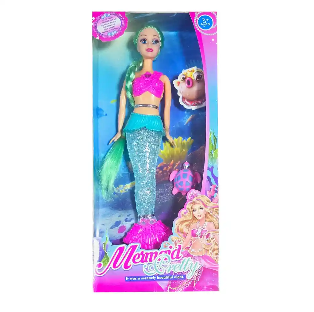 Esta muñeca sirena, con una cola de sirena en colores vibrantes y acabados detallados que le dan un aspecto sorprendentemente realista, viene acompañada de una encantadora tortuga que añade un toque de ternura y magia al juego. Diseñada para estimular la imaginación, este juguete permite a las niñas sumergirse en fantásticas aventuras submarinas, creando historias llenas de creatividad y diversión. /// Nota: Algunos colores del vestido y el cabello de la muñeca pueden variar ligeramente /// Ficha Técnica: Dimensiones de la muñeca: 34 cm x 10 cm Dimensiones del empaque: 37 cm x 17 cm x 4 cm Material: Plástico ABS no toxico Edad recomendada + 3 Años Certificado de conformidad: CS-LCO-13233-2021S2/432 Referencia: 33781C ** _Para defectos de fábrica o retractos: \_Por favor revise el producto apenas lo reciba y antes de usarlo. No aplican ley de retracto o defectos de fábrica luego de usar el producto. Se manejan máximo 5 días para reportar defectos de fábrica (por ejemplo, producto funciona mal, piezas faltantes, rotas, etc). Para hacer efectiva la devolución el producto debe devolverse con el empaque original, el cual debe estar en buen estado, incluir todos los documentos y las partes completas y sin daños.