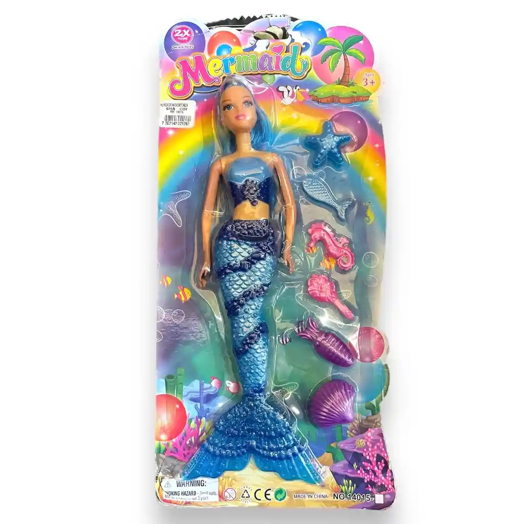 EL BAÚL DE MATIAS Con estas espectaculares sirenas tus pequeñas crearán mundos mágicos y se divertirán mucho poniéndole los accesorios incluidos con esta muñeca. Su cola da visos de colores mientras la mueves gracias al material con que está elaborada esta. Medidas Empaque: 42.5 cm de Alto x 20 cm de Largo x 5 cm de Ancho. Medidas Sirena: 35 cm de Alto x 12 cm de Largo sin extender sus brazos. Materiales: Plástico y cabellos sintéticos.