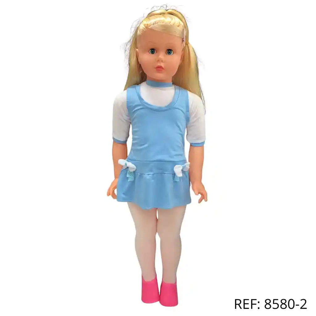 Muñeca con vestido azul y camiseta blanca. Zapatos rosas y diseño divertido ( APROX 86CM )