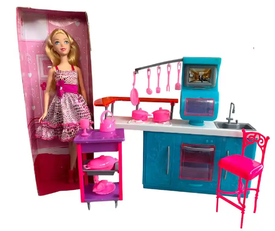 Linda muñeca tipo barbie con cocina y accesorios (silla, ollas, espátulas, plato, copas. Se abren las puertas, tiene horno y microondas. Tipo de Empaque: Caja Medida: 34 cm alto x 44 cm ancho x 7 cm fondo."