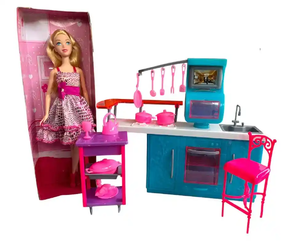 Linda muñeca tipo barbie con cocina y accesorios (silla, ollas, espátulas, plato, copas. Se abren las puertas, tiene horno y microondas. Tipo de Empaque: Caja Medida: 34 cm alto x 44 cm ancho x 7 cm fondo."