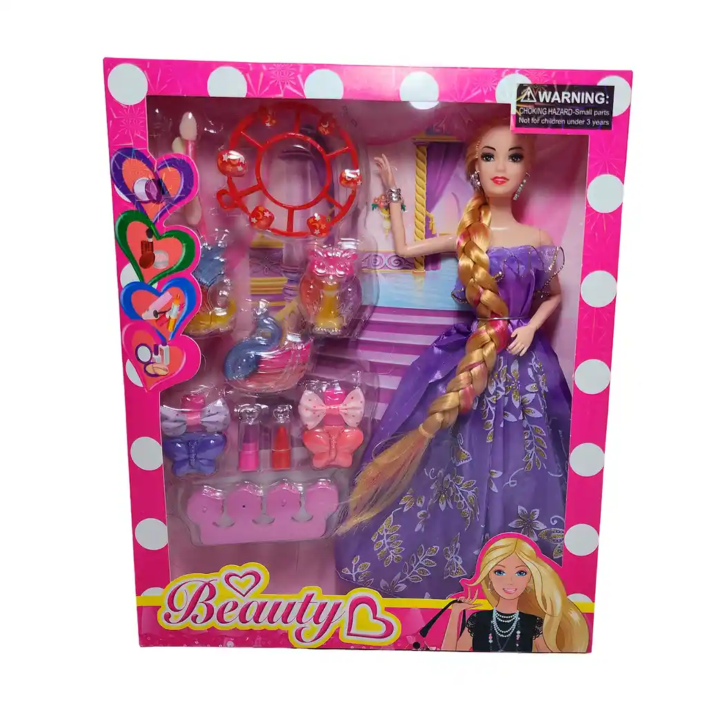 Hermosa muñeca con un elegante vestido largo en tonos morados y detalles florales, ideal para el juego creativo de las niñas; incluye accesorios de belleza como peines, pinzas, moños, esmaltes y un set de decoración que permite crear peinados únicos y divertidos, fomentando la imaginación y el juego de roles en un ambiente lleno de estilo y fantasía. Ficha Técnica: Dimensiones de la muñeca : 30 cm x 6 cm Material : Plástico ABS no tóxico, inodoro e inofensivo Edad Recomendada : +3 Años Referencia: B369-18 Certificado de conformidad: CS-LCO-13233-2021S2/432 Términos de garantía: Para defectos de fábrica o retractos: Por favor revise el producto apenas lo reciba y antes de usarlo. No aplican ley de retracto o defectos de fábrica luego de usar el producto. Se manejan máximo 5 días para reportar defectos de fábrica (por ejemplo, producto funciona mal, piezas faltantes, rotas, etc). Para hacer efectiva la devolución el producto debe devolverse con el empaque original, el cual debe estar en buen estado, incluir todos los documentos y las partes completas y sin daños.