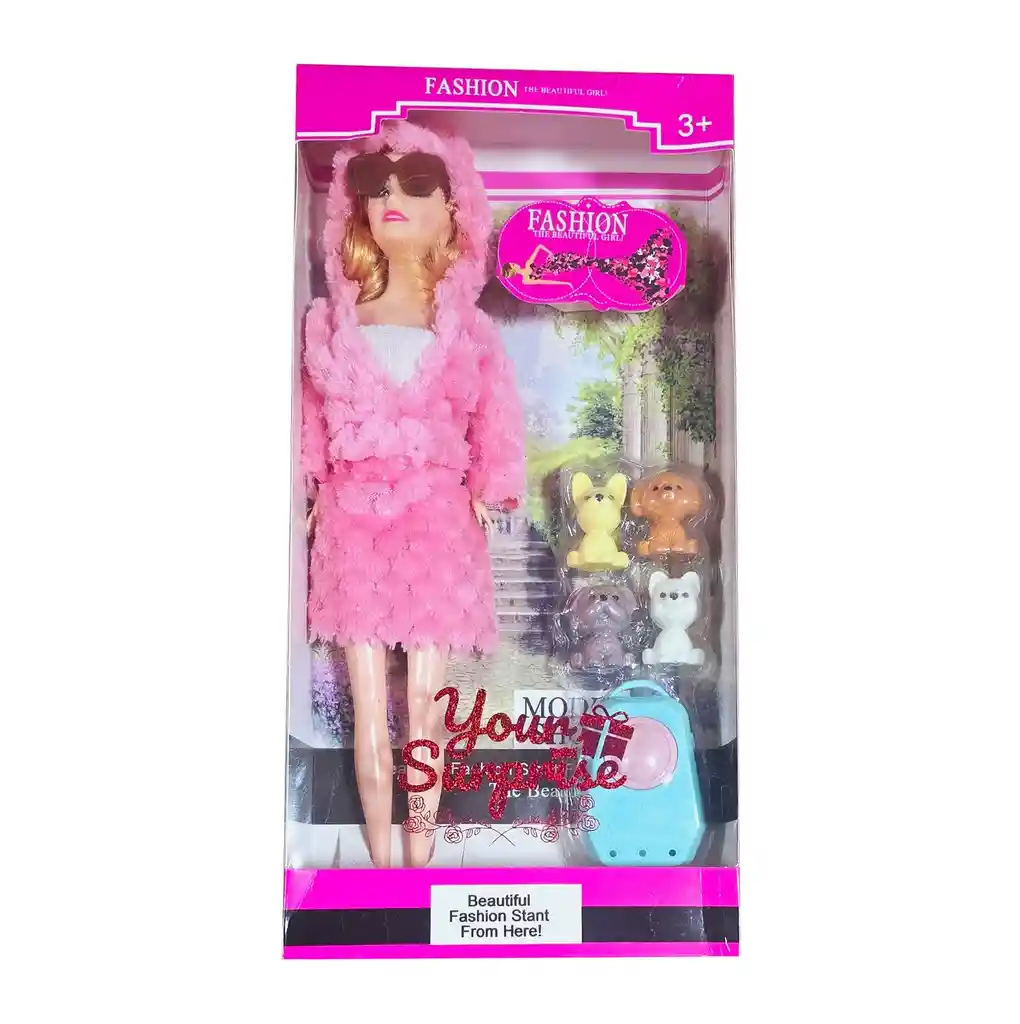 Esta muñeca vestida en vibrantes colores multicolores y con unas modernas gafas viene acompañada de cuatro adorables perritos, brindando la oportunidad de crear divertidas historias llenas de amor por las mascotas. Con este conjunto, las niñas pueden disfrutar de juegos de roles creativos, inventando aventuras y explorando su imaginación mientras cuidan y juegan con sus encantadores amigos peludos. /// Nota: Algunos colores del vestido y el cabello de la muñeca pueden variar ligeramente /// Ficha Técnica: Dimensiones de la muñeca: 29 cm x 9 cm Dimensiones del empaque: 32 cm x 12 cm x 4 cm Material: Plástico ABS no toxico Edad recomendada + 3 Años Certificado de conformidad: CS-LCO-13233-2021S2/432 Referencia: 619A22 MODELO BLM97C ** _Para defectos de fábrica o retractos: \_Por favor revise el producto apenas lo reciba y antes de usarlo. No aplican ley de retracto o defectos de fábrica luego de usar el producto. Se manejan máximo 5 días para reportar defectos de fábrica (por ejemplo, producto funciona mal, piezas faltantes, rotas, etc). Para hacer efectiva la devolución el producto debe devolverse con el empaque original, el cual debe estar en buen estado, incluir todos los documentos y las partes completas y sin daños.
