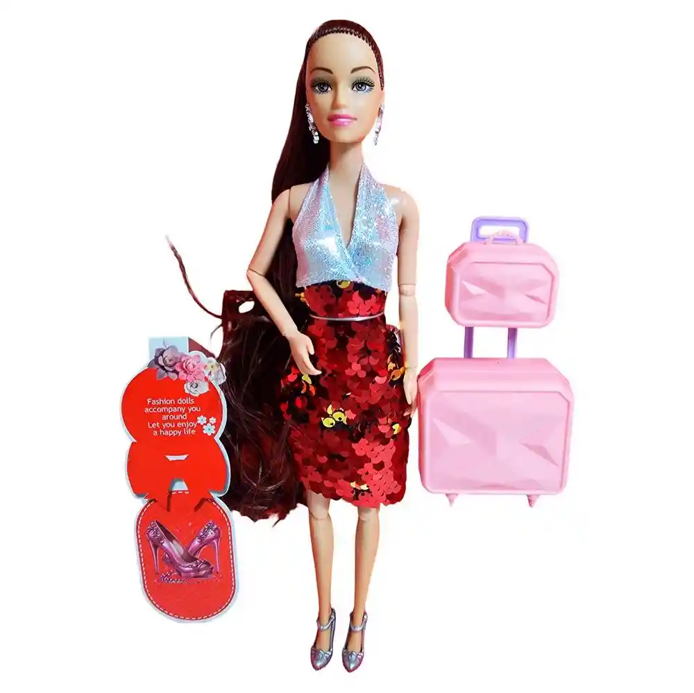 Elegante muñeca Sweet Doll viajera, lista para vivir nuevas aventuras con su moderno atuendo de lentejuelas rojas y blusa plateada brillante. Incluye dos maletas rosadas de viaje y accesorios que completan su look de estilo y glamour. Ideal para fomentar la imaginación y el juego creativo, permitiendo recrear historias llenas de moda y diversión. Perfecta para niñas mayores de 3 años que disfrutan del mundo fashion. Ficha Técnica: Dimensiones de la muñeca : 27 cm x 6 cm Material: Plástico ABS no toxico Edad recomendada + 3 Años Referencia: JM-1265 ML-335B4 Certificado de conformidad: SL-CS-210044 ** _Para defectos de fábrica o retractos: \_Por favor revise el producto apenas lo reciba y antes de usarlo. No aplican ley de retracto o defectos de fábrica luego de usar el producto. Se manejan máximo 5 días para reportar defectos de fábrica (por ejemplo, producto funciona mal, piezas faltantes, rotas, etc). Para hacer efectiva la devolución el producto debe devolverse con el empaque original, el cual debe estar en buen estado, incluir todos los documentos y las partes completas y sin daños.