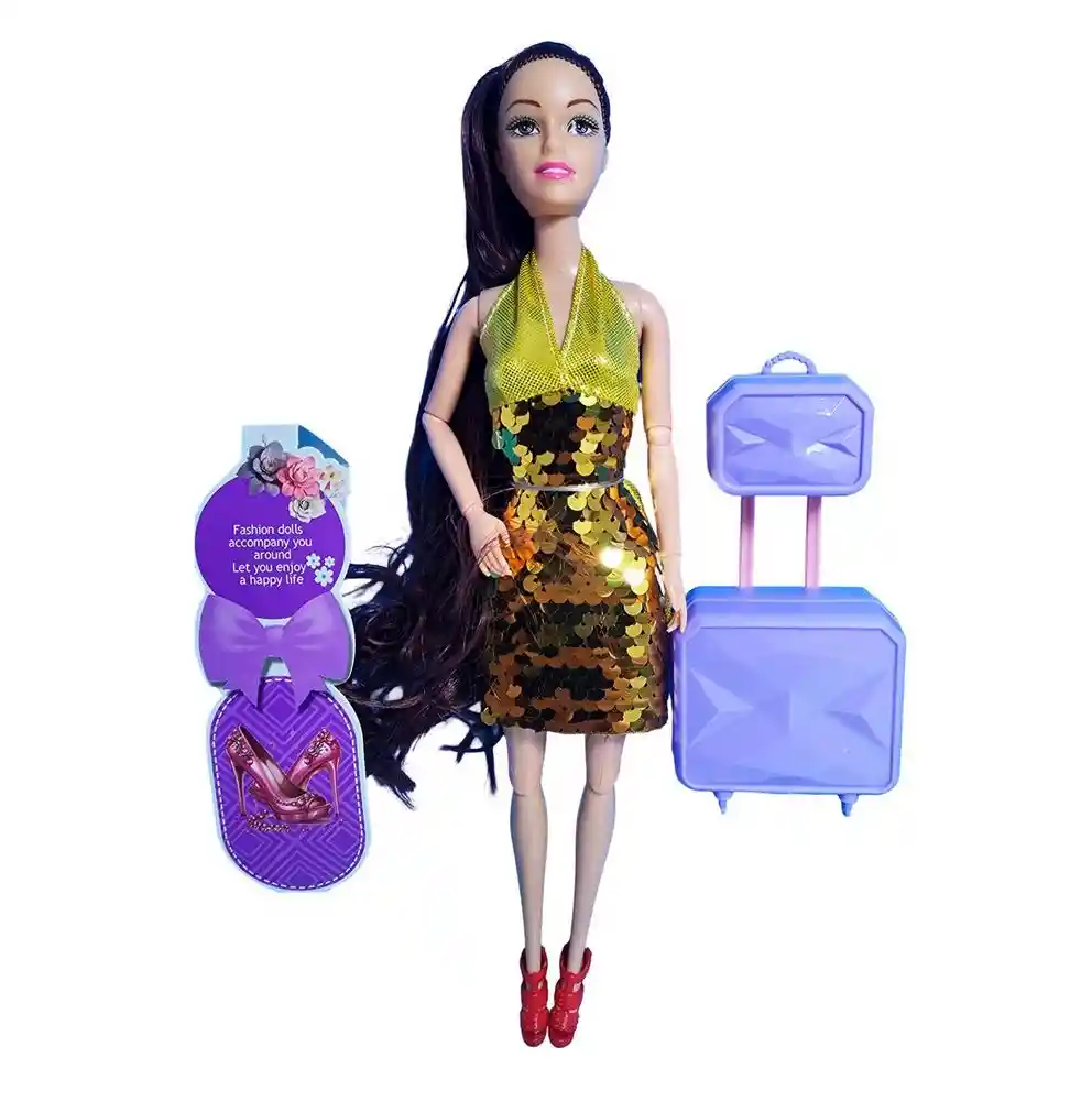 Elegante muñeca Sweet Doll viajera, lista para vivir nuevas aventuras con su moderno atuendo de lentejuelas rojas y blusa plateada brillante. Incluye dos maletas rosadas de viaje y accesorios que completan su look de estilo y glamour. Ideal para fomentar la imaginación y el juego creativo, permitiendo recrear historias llenas de moda y diversión. Perfecta para niñas mayores de 3 años que disfrutan del mundo fashion. Ficha Técnica: Dimensiones de la muñeca : 27 cm x 6 cm Material: Plástico ABS no toxico Edad recomendada + 3 Años Referencia: JM-1265 ML-335B4 Certificado de conformidad: SL-CS-210044 ** _Para defectos de fábrica o retractos: \_Por favor revise el producto apenas lo reciba y antes de usarlo. No aplican ley de retracto o defectos de fábrica luego de usar el producto. Se manejan máximo 5 días para reportar defectos de fábrica (por ejemplo, producto funciona mal, piezas faltantes, rotas, etc). Para hacer efectiva la devolución el producto debe devolverse con el empaque original, el cual debe estar en buen estado, incluir todos los documentos y las partes completas y sin daños.