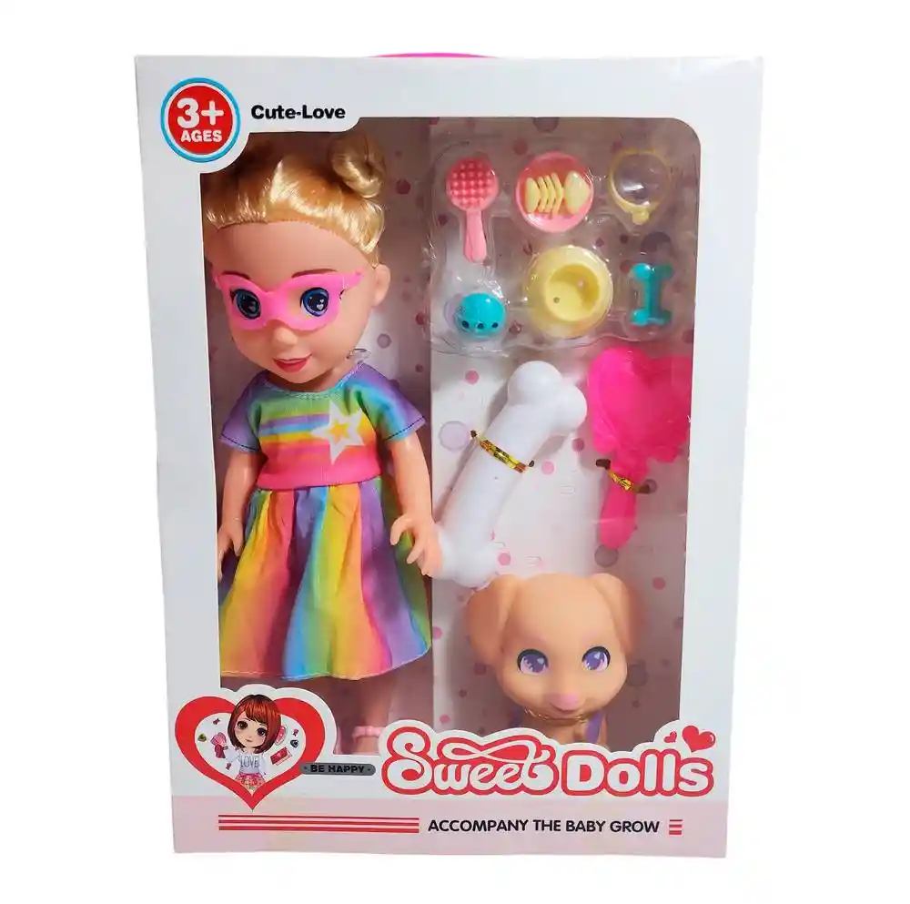 Esta divertida muñeca Sweet Dolls viene con un tierno perrito y accesorios para jugar a cuidarlo, con un look colorido y gafas adorables que la hacen única, ideal para que las niñas imaginen historias de amistad, juego y cariño mientras aprenden sobre el cuidado de las mascotas. Ficha Técnica: Dimensiones de la muñeca: 26 cm x 9 cm Material : Plástico ABS Edad recomendada + 3 Años Certificado de conformidad: SL-CS-210044 Referencia: JM-1333 YG993-3 ** _Para defectos de fábrica o retractos: \_Por favor revise el producto apenas lo reciba y antes de usarlo. No aplican ley de retracto o defectos de fábrica luego de usar el producto. Se manejan máximo 5 días para reportar defectos de fábrica (por ejemplo, producto funciona mal, piezas faltantes, rotas, etc). Para hacer efectiva la devolución el producto debe devolverse con el empaque original, el cual debe estar en buen estado, incluir todos los documentos y las partes completas y sin daños.Esta divertida muñeca Sweet Dolls viene con un tierno perrito y accesorios para jugar a cuidarlo, con un look colorido y gafas adorables que la hacen única, ideal para que las niñas imaginen historias de amistad, juego y cariño mientras aprenden sobre el cuidado de las mascotas. Ficha Técnica: Dimensiones de la muñeca: 26 cm x 9 cm Material : Plástico ABS Edad recomendada + 3 Años Certificado de conformidad: SL-CS-210044 Referencia: JM-1333 YG993-3 ** _Para defectos de fábrica o retractos: \_Por favor revise el producto apenas lo reciba y antes de usarlo. No aplican ley de retracto o defectos de fábrica luego de usar el producto. Se manejan máximo 5 días para reportar defectos de fábrica (por ejemplo, producto funciona mal, piezas faltantes, rotas, etc). Para hacer efectiva la devolución el producto debe devolverse con el empaque original, el cual debe estar en buen estado, incluir todos los documentos y las partes completas y sin daños.