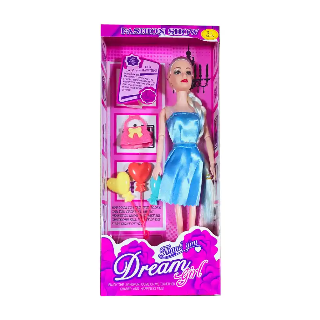 Esta muñeca, con su vestido elegante, viene acompañada de globos en forma de corazón y un bolso de juguete, creando un conjunto ideal para vivir momentos mágicos de juego y celebración, donde las niñas pueden imaginar fiestas, eventos especiales y aventuras llenas de alegría y creatividad. /// El color del cabello de la muñeca y el vestido puede variar ligeramente /// Ficha Técnica: Dimensiones Muñeca: 29 cm x 9 cm Dimensiones del empaque : 32 cm x 12 cm x 4 cm Material: Plástico ABS Edad recomendada: + 3 años Referencia: 2055A Certificado de conformidad: CS-LCO-13233-2021S2/432 ** _Para defectos de fábrica o retractos: \_Por favor revise el producto apenas lo reciba y antes de usarlo. No aplican ley de retracto o defectos de fábrica luego de usar el producto. Se manejan máximo 5 días para reportar defectos de fábrica (por ejemplo, producto funciona mal, piezas faltantes, rotas, etc). Para hacer efectiva la devolución el producto debe devolverse con el empaque original, el cual debe estar en buen estado, incluir todos los documentos y las partes completas y sin daños.
