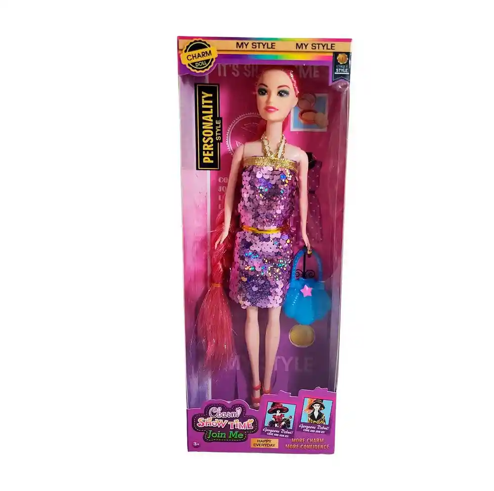 ¡Que comience el "Charm Show Time"! Esta espectacular muñeca "Charm Doll" está lista para deslumbrar con su "Personality Style" único. Robará todas las miradas con su increíblemente larga trenza de cabello y un glamuroso mini vestido de lentejuelas que brilla con cada movimiento. Pero la diversión se multiplica, ya que este set de "Unique Style" un elegante bolso azul con detalle de estrella, . Es el regalo perfecto para niñas mayores de 3 años, inspirando horas de juego, estilo y confianza para un "Happy Everyday". Ficha Técnica: Dimensiones : 28 cm x 7 cm Material: Plástico ABS Edad recomendada + 3 Años Referencia: MU1025 617A11 Certificado de conformidad: CS-LCO-13233-2021S2/432 ** _Para defectos de fábrica o retractos: \_Por favor revise el producto apenas lo reciba y antes de usarlo. No aplican ley de retracto o defectos de fábrica luego de usar el producto. Se manejan máximo 5 días para reportar defectos de fábrica (por ejemplo, producto funciona mal, piezas faltantes, rotas, etc). Para hacer efectiva la devolución el producto debe devolverse con el empaque original, el cual debe estar en buen estado, incluir todos los documentos y las partes completas y sin daños.