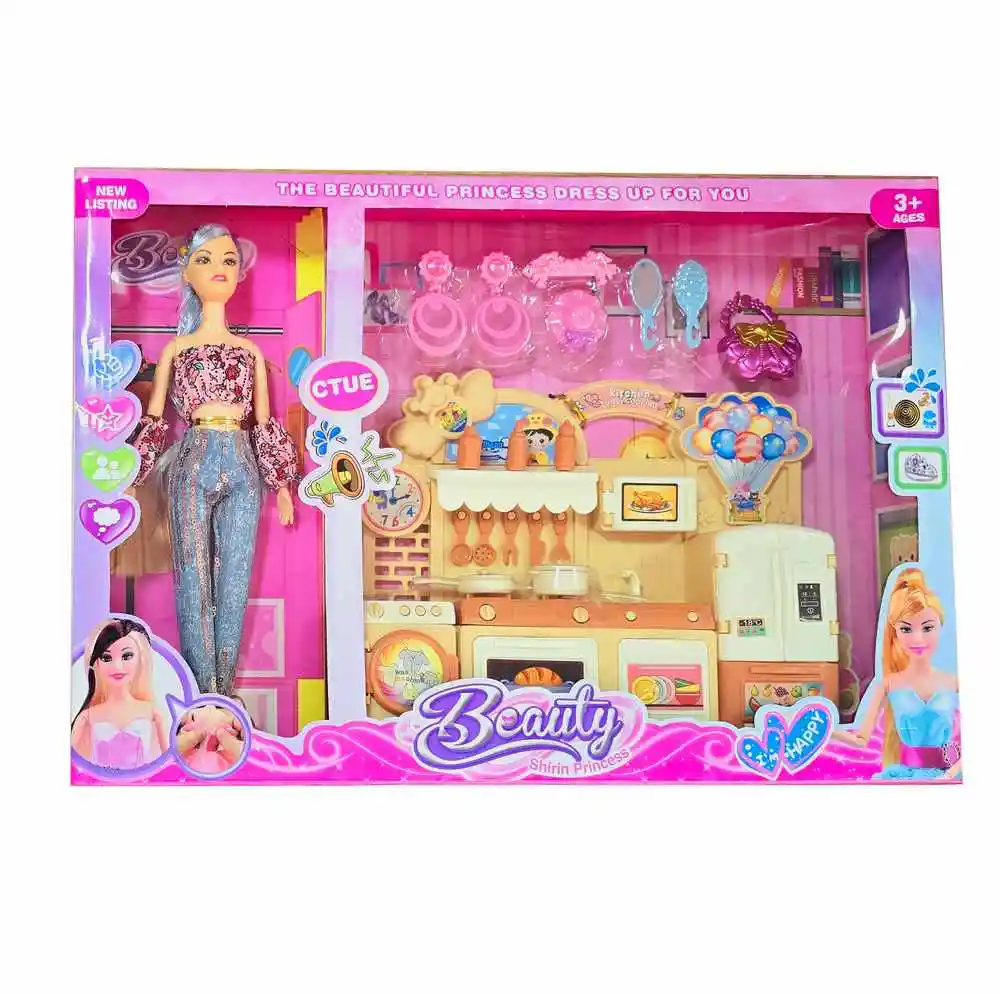Esta encantadora muñeca, vestida con un lindo atuendo, viene acompañada de una cocina completa que incluye un horno, una nevera, un reloj, platos y utensilios de cocina de juguete. Perfecta para el juego de roles, este set permite a los niños explorar su creatividad mientras preparan comidas imaginarias y se sumergen en la rutina diaria de la muñeca en su cocina. Con todos los accesorios necesarios para una experiencia de juego realista, este conjunto es ideal para fomentar el aprendizaje a través del juego y proporcionar horas de diversión interactiva. /// Nota: Los colores de los vestidos y el cabello de las muñecas pueden variar ligeramente /// Ficha Técnica: Dimensiones Muñeca: 29 cm x 9 cm Dimensiones del empaque : 48 cm x 33 cm x 7 cm Material: Plástico ABS Edad recomendada: + 3 años Referencia: MU1021 Certificado de conformidad: CS-LCO-13233-2021S2/432 ** _Para defectos de fábrica o retractos: \_Por favor revise el producto apenas lo reciba y antes de usarlo. No aplican ley de retracto o defectos de fábrica luego de usar el producto. Se manejan máximo 5 días para reportar defectos de fábrica (por ejemplo, producto funciona mal, piezas faltantes, rotas, etc). Para hacer efectiva la devolución el producto debe devolverse con el empaque original, el cual debe estar en buen estado, incluir todos los documentos y las partes completas y sin daños.
