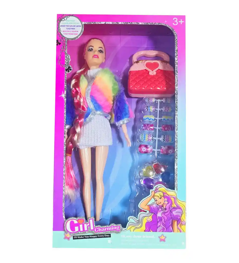 Esta muñeca vestida en vibrantes colores multicolores viene acompañada de un conjunto de uñas de juguete con escarchas y un elegante bolso, ofreciendo una experiencia de juego llena de creatividad y estilo. Con estos divertidos accesorios, las niñas pueden diseñar diferentes looks para su muñeca, explorando su imaginación y disfrutando de horas de entretenimiento mientras inventan historias llenas de brillo y fantasía. /// Nota: Algunos colores del vestido y el cabello de la muñeca pueden variar ligeramente /// Ficha Técnica: Dimensiones de la muñeca: 29 cm x 9 cm Dimensiones del empaque: 32 cm x 12 cm x 4 cm Material: Plástico ABS no toxico Edad recomendada + 3 Años Certificado de conformidad: CS-LCO-13233-2021S2/432 Referencia: MU1033 MODELO 1418-A3 ** _Para defectos de fábrica o retractos: \_Por favor revise el producto apenas lo reciba y antes de usarlo. No aplican ley de retracto o defectos de fábrica luego de usar el producto. Se manejan máximo 5 días para reportar defectos de fábrica (por ejemplo, producto funciona mal, piezas faltantes, rotas, etc). Para hacer efectiva la devolución el producto debe devolverse con el empaque original, el cual debe estar en buen estado, incluir todos los documentos y las partes completas y sin daños.