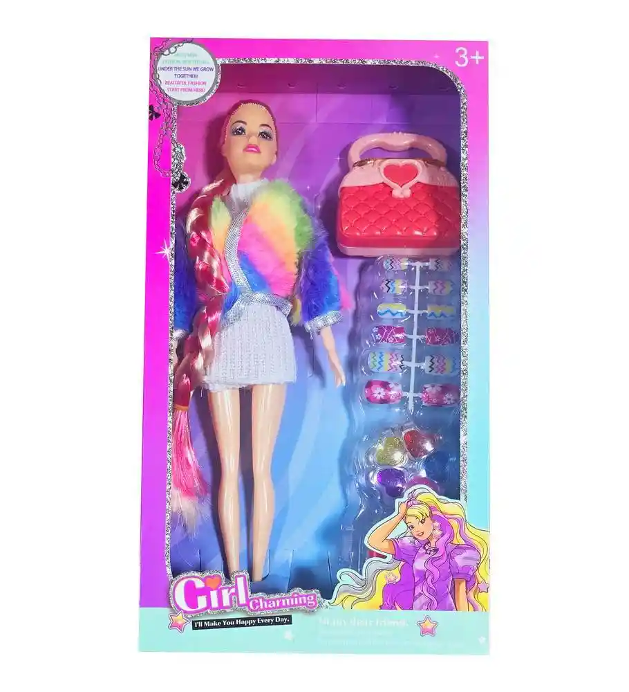 Esta muñeca vestida en vibrantes colores multicolores viene acompañada de un conjunto de uñas de juguete con escarchas y un elegante bolso, ofreciendo una experiencia de juego llena de creatividad y estilo. Con estos divertidos accesorios, las niñas pueden diseñar diferentes looks para su muñeca, explorando su imaginación y disfrutando de horas de entretenimiento mientras inventan historias llenas de brillo y fantasía. /// Nota: Algunos colores del vestido y el cabello de la muñeca pueden variar ligeramente /// Ficha Técnica: Dimensiones de la muñeca: 29 cm x 9 cm Dimensiones del empaque: 32 cm x 12 cm x 4 cm Material: Plástico ABS no toxico Edad recomendada + 3 Años Certificado de conformidad: CS-LCO-13233-2021S2/432 Referencia: MU1033 MODELO 1418-A3 ** _Para defectos de fábrica o retractos: \_Por favor revise el producto apenas lo reciba y antes de usarlo. No aplican ley de retracto o defectos de fábrica luego de usar el producto. Se manejan máximo 5 días para reportar defectos de fábrica (por ejemplo, producto funciona mal, piezas faltantes, rotas, etc). Para hacer efectiva la devolución el producto debe devolverse con el empaque original, el cual debe estar en buen estado, incluir todos los documentos y las partes completas y sin daños.