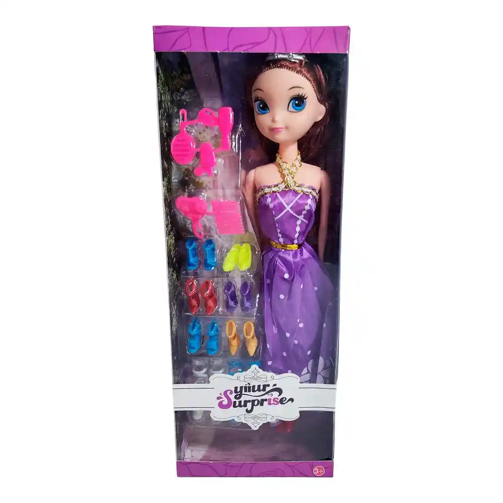 Haz que cada juego sea una pasarela con esta elegante muñeca tipo princesa que incluye un hermoso vestido largo estampado, accesorios para peinarla y una gran variedad de zapatos de colores para combinar diferentes estilos, fomentando la creatividad y la imaginación de los niños mientras crean looks únicos y se divierten cambiando su atuendo; perfecta para niñas de 3 años en adelante que disfrutan del juego de moda y aventuras. Ficha Técnica: Dimensiones : 29 cm x 6 cm Material: Plástico ABS Edad Apta : + 3 años Referencia: MU1086 BLM56C Certificado de conformidad: E5-0359-2021 Términos de Garantía: Para defectos de fábrica o retractos: Por favor revise el producto apenas lo reciba y antes de usarlo. No aplican ley de retracto o defectos de fábrica luego de usar el producto. Se manejan máximo 5 días para reportar defectos de fábrica (por ejemplo, producto funciona mal, piezas faltantes, rotas, etc). Para hacer efectiva la devolución el producto debe devolverse con el empaque original, el cual debe estar en buen estado, incluir todos los documentos y las partes completas y sin daños.