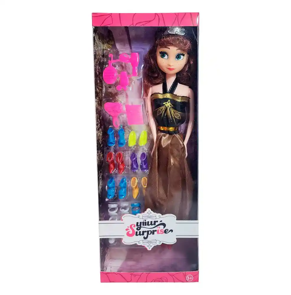 Haz que cada juego sea una pasarela con esta elegante muñeca tipo princesa que incluye un hermoso vestido largo estampado, accesorios para peinarla y una gran variedad de zapatos de colores para combinar diferentes estilos, fomentando la creatividad y la imaginación de los niños mientras crean looks únicos y se divierten cambiando su atuendo; perfecta para niñas de 3 años en adelante que disfrutan del juego de moda y aventuras. Ficha Técnica: Dimensiones : 29 cm x 6 cm Material: Plástico ABS Edad Apta : + 3 años Referencia: MU1086 BLM56C Certificado de conformidad: E5-0359-2021 Términos de Garantía: Para defectos de fábrica o retractos: Por favor revise el producto apenas lo reciba y antes de usarlo. No aplican ley de retracto o defectos de fábrica luego de usar el producto. Se manejan máximo 5 días para reportar defectos de fábrica (por ejemplo, producto funciona mal, piezas faltantes, rotas, etc). Para hacer efectiva la devolución el producto debe devolverse con el empaque original, el cual debe estar en buen estado, incluir todos los documentos y las partes completas y sin daños.
