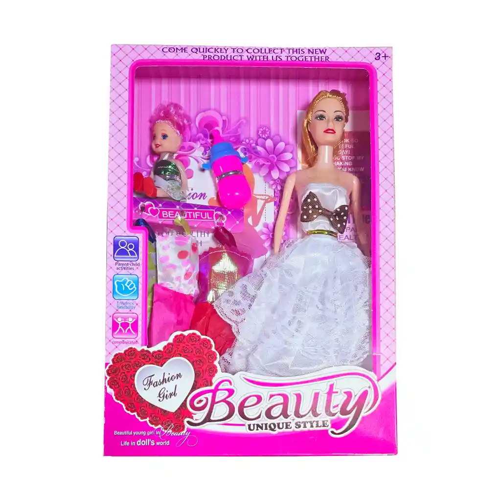 Esta encantadora muñeca viene acompañada de tres vestidos adicionales, permitiendo cambiar su estilo para cualquier ocasión. El set incluye también una pequeña muñeca y un tetero, lo que añade un toque de ternura y cuidado al juego. Perfecto para crear historias llenas de moda y amor, este set invita a los niños a disfrutar de horas de diversión creativa. /// Nota: Los colores de los vestidos de las muñecas pueden variar ligeramente /// Ficha Técnica: Dimensiones Muñeca: 28 cm x 08 cm Dimensiones del empaque : 32 cm x 22 cm x 5 cm Material: Plástico ABS Edad recomendada: + 3 años Referencia: 1109A Certificado de conformidad: CS-LCO-13233-2021S2/432 ** _Para defectos de fábrica o retractos: \_Por favor revise el producto apenas lo reciba y antes de usarlo. No aplican ley de retracto o defectos de fábrica luego de usar el producto. Se manejan máximo 5 días para reportar defectos de fábrica (por ejemplo, producto funciona mal, piezas faltantes, rotas, etc). Para hacer efectiva la devolución el producto debe devolverse con el empaque original, el cual debe estar en buen estado, incluir todos los documentos y las partes completas y sin daños.
