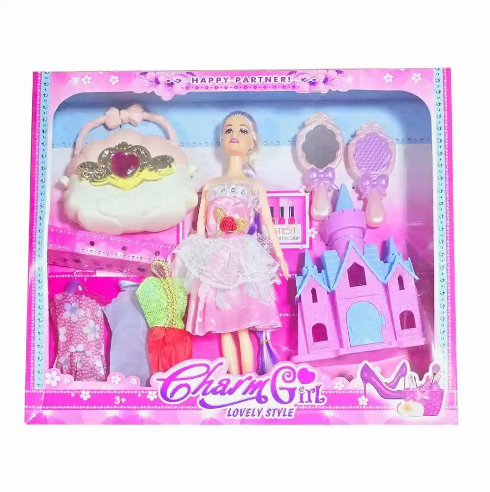 Esta muñeca viene acompañada de un encantador castillo que invita a vivir mágicas aventuras y cuentos de hadas. Además, cuenta con una variedad de vestidos elegantes para cambiar de estilo en cada ocasión especial y un bolso adornado con un corazón en su centro, que añade un toque de ternura y encanto al conjunto. Este juguete es perfecto para estimular la imaginación y la creatividad, permitiendo a las niñas crear sus propias historias llenas de magia y diversión. /// Nota: Algunos colores del vestido y el cabello de la muñeca pueden variar ligeramente /// Ficha Técnica: Dimensiones de la muñeca: 29 cm x 9 cm Dimensiones del empaque: 38 cm x 32 cm x 5 cm Material: Plástico ABS no toxico Edad recomendada + 3 Años Certificado de conformidad: CS-LCO-13233-2021S2/432 Referencia: 8189D3 MODELO YB024E5 ** _Para defectos de fábrica o retractos: \_Por favor revise el producto apenas lo reciba y antes de usarlo. No aplican ley de retracto o defectos de fábrica luego de usar el producto. Se manejan máximo 5 días para reportar defectos de fábrica (por ejemplo, producto funciona mal, piezas faltantes, rotas, etc). Para hacer efectiva la devolución el producto debe devolverse con el empaque original, el cual debe estar en buen estado, incluir todos los documentos y las partes completas y sin daños.