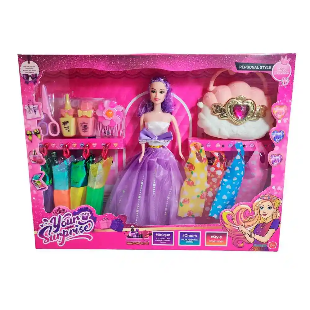 Este fabuloso set Your Surprise trae una hermosa muñeca con largo cabello, una colección de elegantes vestidos y accesorios de belleza para transformar cada juego en un desfile de moda, permitiendo crear infinitos looks llenos de estilo, brillo y encanto mientras las niñas dan rienda suelta a su imaginación y creatividad. Ficha Técnica: Dimensiones de la muñeca: 30 cm x 6 cm Material : Plástico ABS Edad recomendada + 3 Años Certificado de conformidad: SL-CS-210044 Referencia: 2021B 633A6 ** _Para defectos de fábrica o retractos: \_Por favor revise el producto apenas lo reciba y antes de usarlo. No aplican ley de retracto o defectos de fábrica luego de usar el producto. Se manejan máximo 5 días para reportar defectos de fábrica (por ejemplo, producto funciona mal, piezas faltantes, rotas, etc). Para hacer efectiva la devolución el producto debe devolverse con el empaque original, el cual debe estar en buen estado, incluir todos los documentos y las partes completas y sin daños.