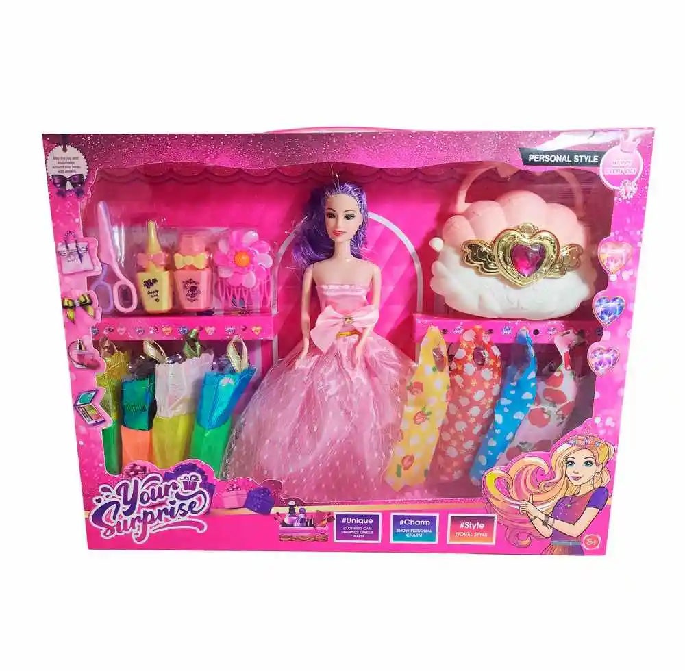 Este fabuloso set Your Surprise trae una hermosa muñeca con largo cabello, una colección de elegantes vestidos y accesorios de belleza para transformar cada juego en un desfile de moda, permitiendo crear infinitos looks llenos de estilo, brillo y encanto mientras las niñas dan rienda suelta a su imaginación y creatividad. Ficha Técnica: Dimensiones de la muñeca: 30 cm x 6 cm Material : Plástico ABS Edad recomendada + 3 Años Certificado de conformidad: SL-CS-210044 Referencia: 2021B 633A6 ** _Para defectos de fábrica o retractos: \_Por favor revise el producto apenas lo reciba y antes de usarlo. No aplican ley de retracto o defectos de fábrica luego de usar el producto. Se manejan máximo 5 días para reportar defectos de fábrica (por ejemplo, producto funciona mal, piezas faltantes, rotas, etc). Para hacer efectiva la devolución el producto debe devolverse con el empaque original, el cual debe estar en buen estado, incluir todos los documentos y las partes completas y sin daños.