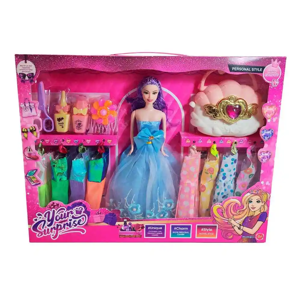 Este fabuloso set Your Surprise trae una hermosa muñeca con largo cabello, una colección de elegantes vestidos y accesorios de belleza para transformar cada juego en un desfile de moda, permitiendo crear infinitos looks llenos de estilo, brillo y encanto mientras las niñas dan rienda suelta a su imaginación y creatividad. Ficha Técnica: Dimensiones de la muñeca: 30 cm x 6 cm Material : Plástico ABS Edad recomendada + 3 Años Certificado de conformidad: SL-CS-210044 Referencia: 2021B 633A6 ** _Para defectos de fábrica o retractos: \_Por favor revise el producto apenas lo reciba y antes de usarlo. No aplican ley de retracto o defectos de fábrica luego de usar el producto. Se manejan máximo 5 días para reportar defectos de fábrica (por ejemplo, producto funciona mal, piezas faltantes, rotas, etc). Para hacer efectiva la devolución el producto debe devolverse con el empaque original, el cual debe estar en buen estado, incluir todos los documentos y las partes completas y sin daños.