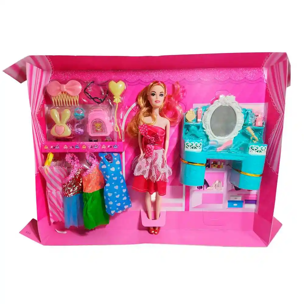 Este encantador set Your Surprise incluye una muñeca con espectacular vestido azul, varios atuendos adicionales y un tocador completo con accesorios de belleza para peinar, maquillar y transformar su look en cada aventura, invitando a las niñas a jugar con la moda y la imaginación mientras crean historias llenas de estilo y diversión. Ficha Técnica: Dimensiones de la muñeca: 30 cm x 6 cm Material : Plástico ABS Edad recomendada + 3 Años Certificado de conformidad: SL-CS-210044 Referencia: I1421174 633A1 ** _Para defectos de fábrica o retractos: \_Por favor revise el producto apenas lo reciba y antes de usarlo. No aplican ley de retracto o defectos de fábrica luego de usar el producto. Se manejan máximo 5 días para reportar defectos de fábrica (por ejemplo, producto funciona mal, piezas faltantes, rotas, etc). Para hacer efectiva la devolución el producto debe devolverse con el empaque original, el cual debe estar en buen estado, incluir todos los documentos y las partes completas y sin daños.