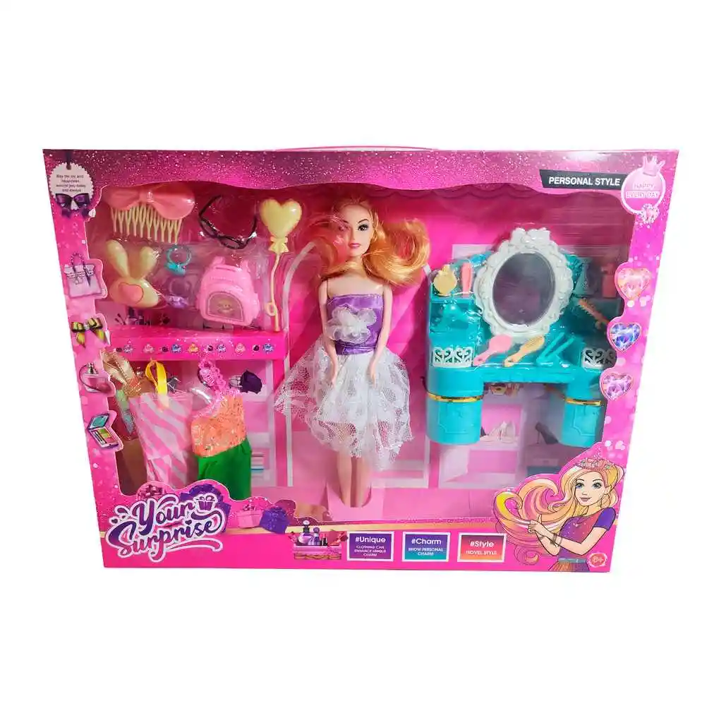 Este encantador set Your Surprise incluye una muñeca con espectacular vestido azul, varios atuendos adicionales y un tocador completo con accesorios de belleza para peinar, maquillar y transformar su look en cada aventura, invitando a las niñas a jugar con la moda y la imaginación mientras crean historias llenas de estilo y diversión. Ficha Técnica: Dimensiones de la muñeca: 30 cm x 6 cm Material : Plástico ABS Edad recomendada + 3 Años Certificado de conformidad: SL-CS-210044 Referencia: I1421174 633A1 ** _Para defectos de fábrica o retractos: \_Por favor revise el producto apenas lo reciba y antes de usarlo. No aplican ley de retracto o defectos de fábrica luego de usar el producto. Se manejan máximo 5 días para reportar defectos de fábrica (por ejemplo, producto funciona mal, piezas faltantes, rotas, etc). Para hacer efectiva la devolución el producto debe devolverse con el empaque original, el cual debe estar en buen estado, incluir todos los documentos y las partes completas y sin daños.