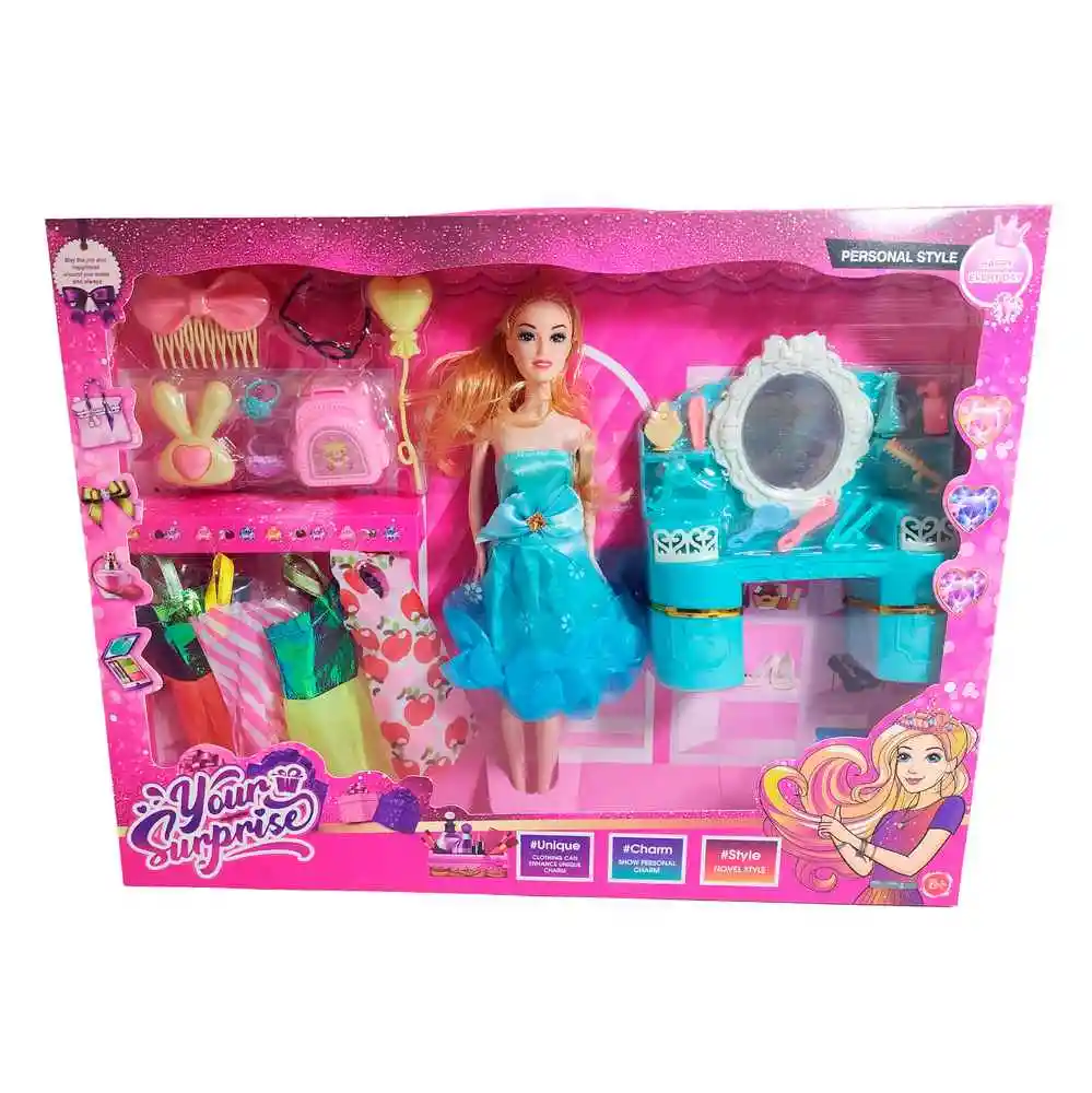 Este encantador set Your Surprise incluye una muñeca con espectacular vestido azul, varios atuendos adicionales y un tocador completo con accesorios de belleza para peinar, maquillar y transformar su look en cada aventura, invitando a las niñas a jugar con la moda y la imaginación mientras crean historias llenas de estilo y diversión. Ficha Técnica: Dimensiones de la muñeca: 30 cm x 6 cm Material : Plástico ABS Edad recomendada + 3 Años Certificado de conformidad: SL-CS-210044 Referencia: I1421174 633A1 ** _Para defectos de fábrica o retractos: \_Por favor revise el producto apenas lo reciba y antes de usarlo. No aplican ley de retracto o defectos de fábrica luego de usar el producto. Se manejan máximo 5 días para reportar defectos de fábrica (por ejemplo, producto funciona mal, piezas faltantes, rotas, etc). Para hacer efectiva la devolución el producto debe devolverse con el empaque original, el cual debe estar en buen estado, incluir todos los documentos y las partes completas y sin daños.