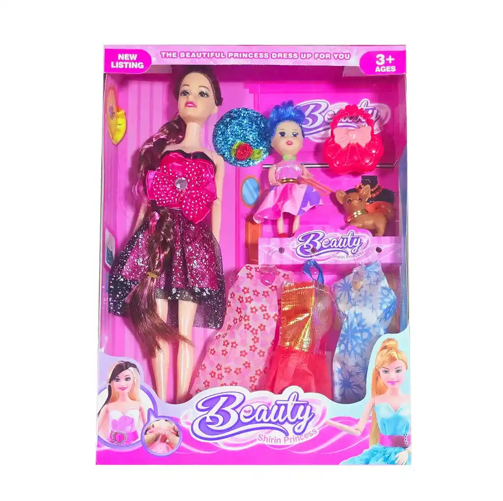 Esta muñeca, con un hermoso vestido, viene acompañada de un elegante sombrero con exquisitos detalles que le añade un toque de sofisticación. Además, incluye varios vestidos adicionales para cambiar de estilo, permitiendo a las niñas crear diferentes combinaciones y looks. Junto a ella, una muñeca mini como compañera y un adorable perrito de mascota completan este encantador set, ideal para juegos de roles llenos de creatividad, imaginación y diversión. /// Nota: Algunos colores del vestido y el cabello de la muñeca pueden variar ligeramente /// Ficha Técnica: Dimensiones de la muñeca: 29 cm x 9 cm Dimensiones del empaque: 32 cm x 22 cm x 5 cm Material: Plástico ABS no toxico Edad recomendada + 3 Años Certificado de conformidad: CS-LCO-13233-2021S2/432 Referencia: 619A1 ** _Para defectos de fábrica o retractos: \_Por favor revise el producto apenas lo reciba y antes de usarlo. No aplican ley de retracto o defectos de fábrica luego de usar el producto. Se manejan máximo 5 días para reportar defectos de fábrica (por ejemplo, producto funciona mal, piezas faltantes, rotas, etc). Para hacer efectiva la devolución el producto debe devolverse con el empaque original, el cual debe estar en buen estado, incluir todos los documentos y las partes completas y sin daños.