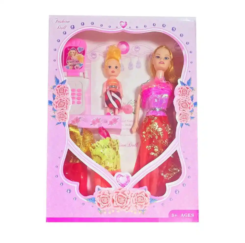 Esta muñeca, con un hermoso vestido, viene acompañada de varios elegantes vestidos adicionales para intercambiar, permitiendo a las niñas explorar diferentes estilos y combinaciones. Además, incluye una muñeca mini y un pequeño celular de juguete, añadiendo un toque moderno y divertido al juego. Este conjunto invita a las pequeñas a disfrutar de juegos de roles creativos, imaginando historias y aventuras mientras desarrollan su imaginación y habilidades sociales en un mundo lleno de diversión. /// Nota: Algunos colores del vestido y el cabello de la muñeca pueden variar ligeramente /// Ficha Técnica: Dimensiones de la muñeca: 29 cm x 9 cm Dimensiones del empaque: 32 cm x 22 cm x 5 cm Material: Plástico ABS no toxico Edad recomendada + 3 Años Certificado de conformidad: CS-LCO-13233-2021S2/432 Referencia: 824C2 ** _Para defectos de fábrica o retractos: \_Por favor revise el producto apenas lo reciba y antes de usarlo. No aplican ley de retracto o defectos de fábrica luego de usar el producto. Se manejan máximo 5 días para reportar defectos de fábrica (por ejemplo, producto funciona mal, piezas faltantes, rotas, etc). Para hacer efectiva la devolución el producto debe devolverse con el empaque original, el cual debe estar en buen estado, incluir todos los documentos y las partes completas y sin daños.