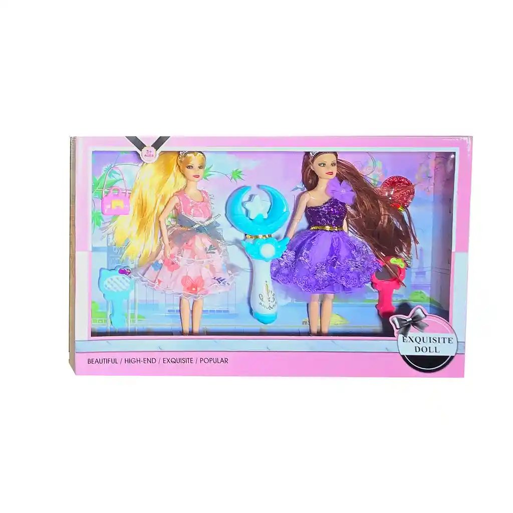 Este encantador set incluye dos muñecas vestidas con coloridos atuendos, cada una coronada con su propia diadema de princesa, listas para reinar en un mundo de fantasía. El set viene acompañado de accesorios de moda, como un bolso, un gorro, un peine de Hello Kitty y un espejo a juego, permitiendo a las niñas crear momentos mágicos mientras juegan con estilo y diversión. /// Nota: Los colores de los vestidos de las muñecas pueden variar ligeramente /// Ficha Técnica: Dimensiones Muñeca: 28 cm x 9 cm Dimensiones del empaque : 52 cm x 32 cm x 5 cm Material: Plástico ABS Edad recomendada: + 3 años Referencia: 824C2 Certificado de conformidad: CS-LCO-13233-2021S2/432 ** _Para defectos de fábrica o retractos: \_Por favor revise el producto apenas lo reciba y antes de usarlo. No aplican ley de retracto o defectos de fábrica luego de usar el producto. Se manejan máximo 5 días para reportar defectos de fábrica (por ejemplo, producto funciona mal, piezas faltantes, rotas, etc). Para hacer efectiva la devolución el producto debe devolverse con el empaque original, el cual debe estar en buen estado, incluir todos los documentos y las partes completas y sin daños.