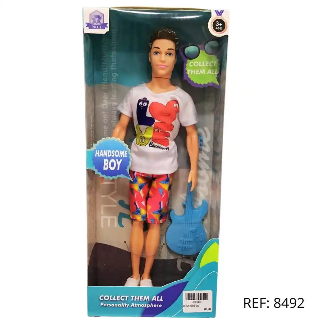 Muñeco articulado con camiseta estampada y guitarra azul. Fomenta el juego imaginativo y coleccionismo.