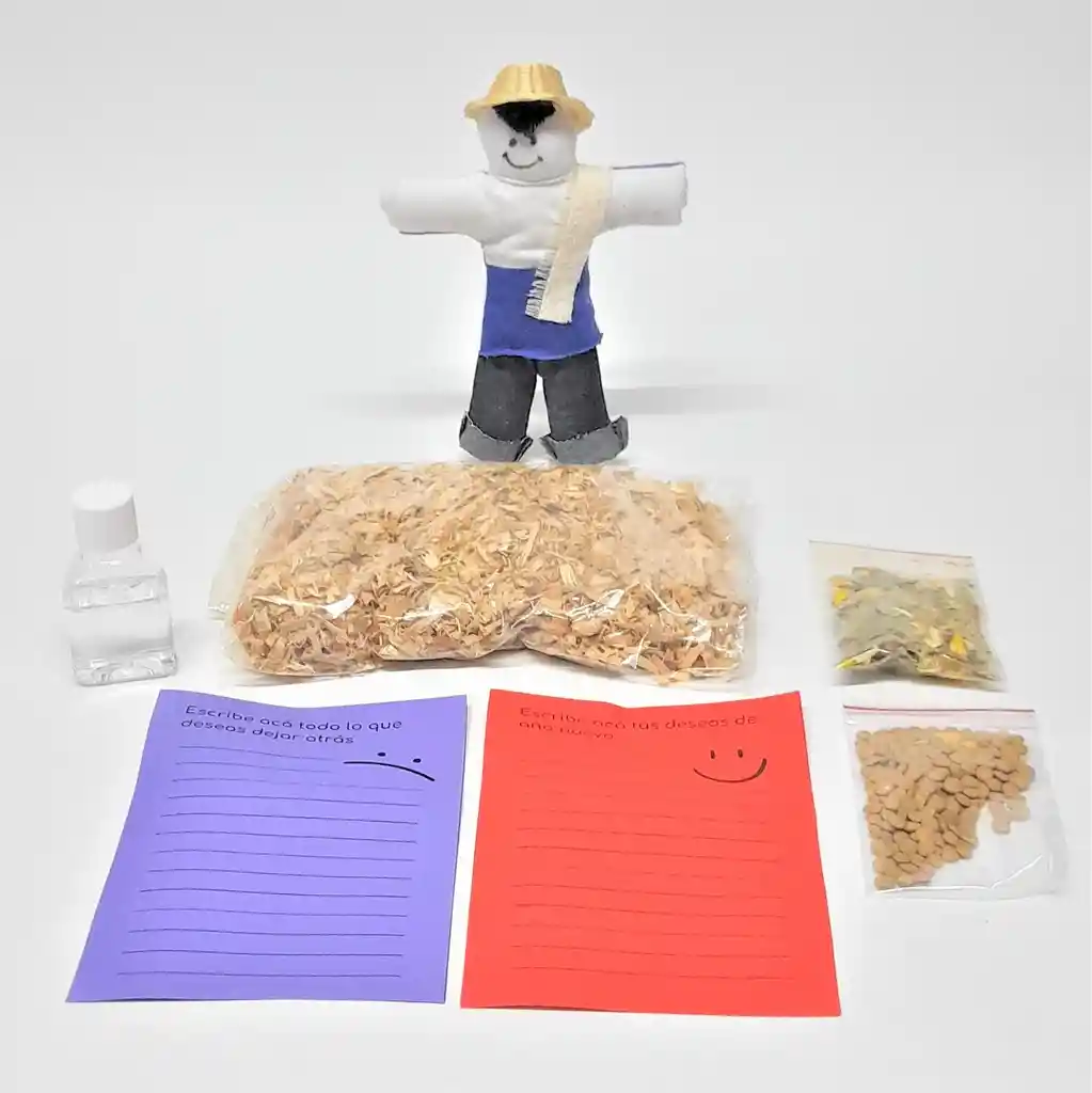Muñeco de Navidad de año viejo que incluye: muñeco, bolsa con acerrín, frasquito con alcohol, bolsita con semillas, bolsita con piedras y hojas para escribir los deseos
