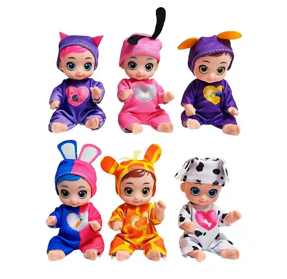 Despierta un mundo de ternura con este set de colección "Lovely Baby", que incluye 6 adorables mini muñecas listas para la diversión. Cada bebé de este set de 6 piezas tiene una personalidad única, luciendo un mameluco de animalito diferente, como un tierno dálmata, una jirafa, un conejito bicolor, un gatito ¡y más! Con sus enormes ojos expresivos y sus coloridos gorritos con orejas, estas muñecas son perfectas para coleccionar, intercambiar e inspirar horas de juego imaginativo. Es el regalo ideal para mayores de 3 años, ofreciendo un grupo completo de dulces amigos en un solo paquete. Ficha Técnica: Dimensiones : 10 cm x 5 cm Material: Plástico ABS Edad recomendada + 3 Años Referencia: H5-MID 278 Certificado de conformidad: CS-LCO-13233-2021S2/432 ** _Para defectos de fábrica o retractos: \_Por favor revise el producto apenas lo reciba y antes de usarlo. No aplican ley de retracto o defectos de fábrica luego de usar el producto. Se manejan máximo 5 días para reportar defectos de fábrica (por ejemplo, producto funciona mal, piezas faltantes, rotas, etc). Para hacer efectiva la devolución el producto debe devolverse con el empaque original, el cual debe estar en buen estado, incluir todos los documentos y las partes completas y sin daños.
