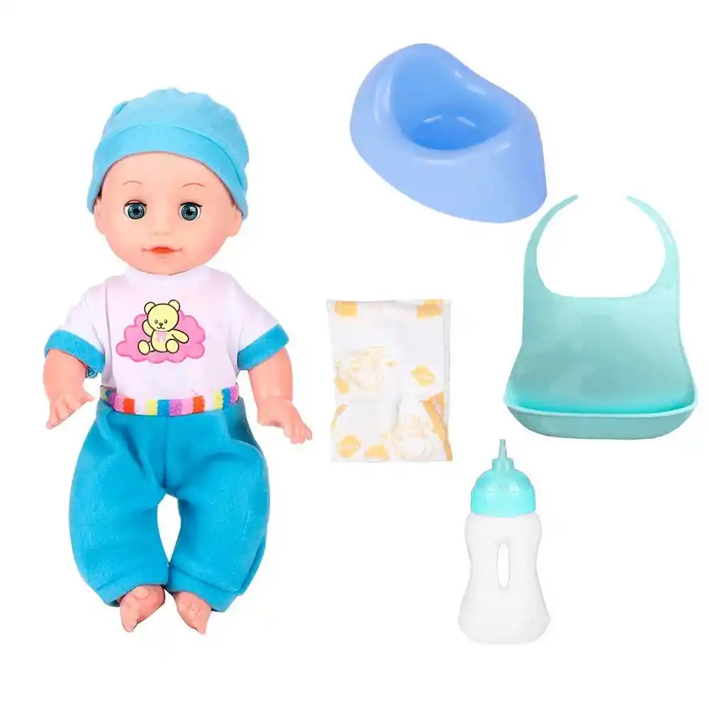 Este adorable muñeco bebé incluye un tetero, un biberón, un pañal y una vacinilla, creando un set de juego completo para que las niñas se diviertan cuidando y alimentando a su bebé, fomentando su imaginación, empatía y habilidades de cuidado a través del juego. /// Nota: Algunos colores de la pijama pueden variar /// Ficha Técnica: Material: Plástico libre de BPA Dimensión de la muñeca: 31 cm x 14 cm Dimensión del empaque: 33 cm x 29 cm x 11 cm Apto para niños + 3 Años Referencia: SY003-17 Certificado de conformidad: CS-LCO-13233-2021S2/432 ** _Para defectos de fábrica o retractos: \_Por favor revise el producto apenas lo reciba y antes de usarlo. No aplican ley de retracto o defectos de fábrica luego de usar el producto. Se manejan máximo 5 días para reportar defectos de fábrica (por ejemplo, producto funciona mal, piezas faltantes, rotas, etc). Para hacer efectiva la devolución el producto debe devolverse con el empaque original, el cual debe estar en buen estado, incluir todos los documentos y las partes completas y sin daños.
