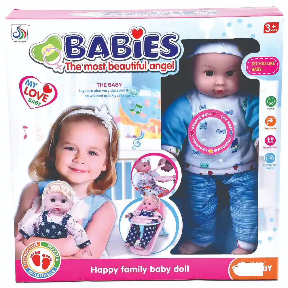 NOMBRE: MUÑECO CON COMEDOR BABIES 5 SONIDOS CAJA DESCRIPCION: Lindo y Alegre Muñeco con Sonido ideal para que los pequeños vivan una experiencia mágica y divertida, jugando y recreando experiencias del cuidado de la familia con amor y responsabilidad. Este muñeco ayuda a reforzar los vínculos emocionales en los niños y a expresar sus emociones en momentos importantes de la vida, como la llegada de un nuevo hermanito. Jugar con muñecas hace que el mundo sea más comprensible para los niños y les ayuda a desarrollar confianza en su capacidad para resolver problemas e interactuar con su entorno. Requiere 3 pilas de reloj no incluidas. - Dimensiones del producto empacado: 34.5X35X9.5 centímetros - Disponibilidad permanente - Despachos a nivel nacional - Tiempo de entrega aproximado 3 a 4 días hábiles contados a partir del día hábil siguiente al pedido. La plataforma te dará un tiempo de entrega mas preciso al momento de concretar la compra. Estamos atentos a resolver cualquier inquietud que tengas después de revisar las fotos y descripción del producto. JUGUETELANDIA más de 30 años ofreciendo diversión.