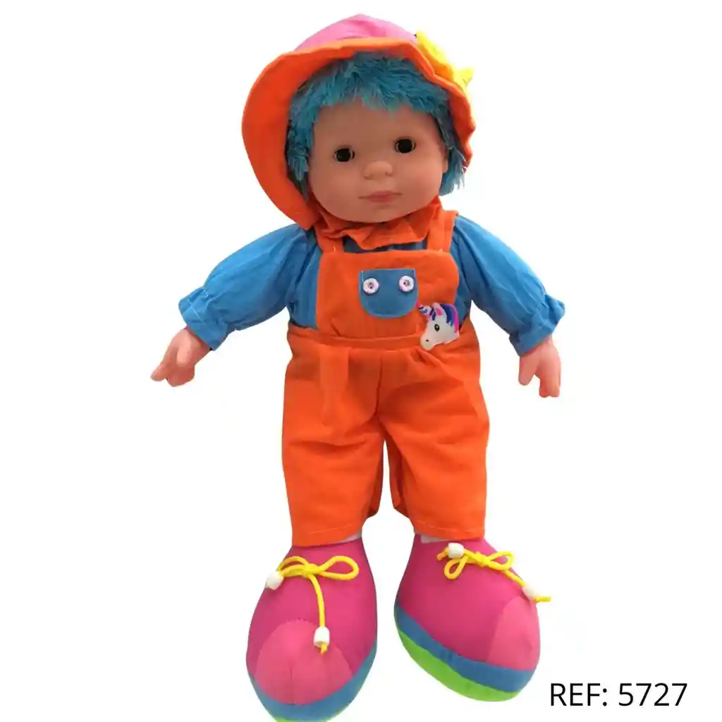 Muñeco con pelo azul, overol naranja y zapatos grandes. Colorido y divertido para jugar y abrazar. ( aprox 56cm )