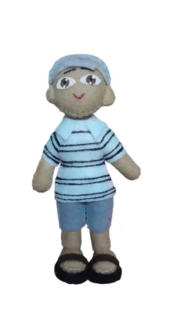 Muñeco artesanal de tela hecho a mano, con detalles bordados y diseño tierno. Viste camiseta de rayas, pantalón corto azul y sandalias, con un estilo fresco y casual. Suave y ligero, ideal como regalo, decoración o compañero de juego para niños. Un producto único y lleno de encanto artesanal.