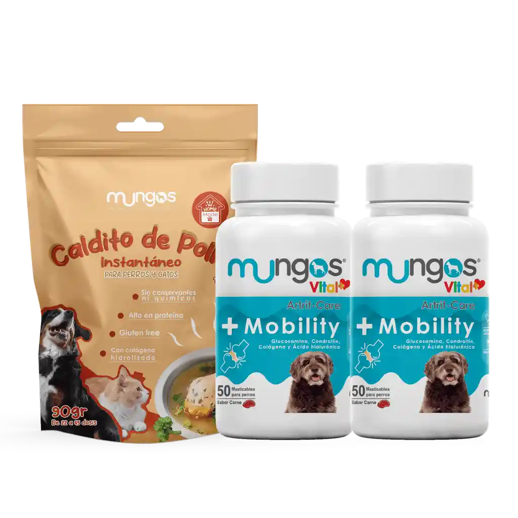 Bienestar articular y sabor reconfortante. Tabletas con colágeno + caldito alto en proteína para perros y gatos.